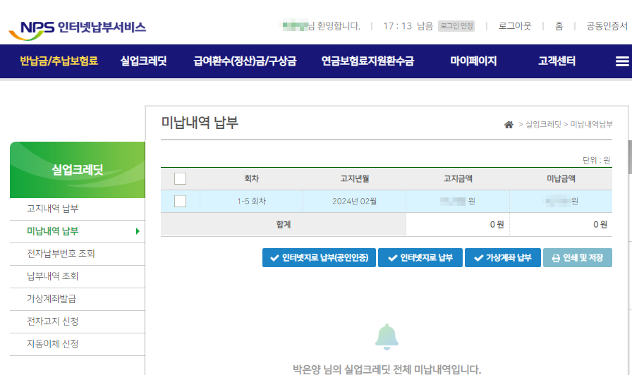 실업크레딧 미납급액 납부 방법