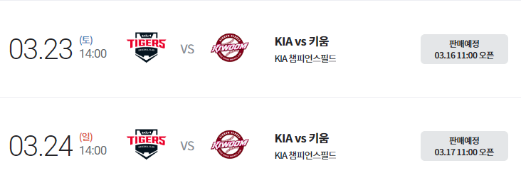 기아 챔피언스 필드에서는 3월 23일 키움 히어로즈와의 2연전 경기가 있습니다.