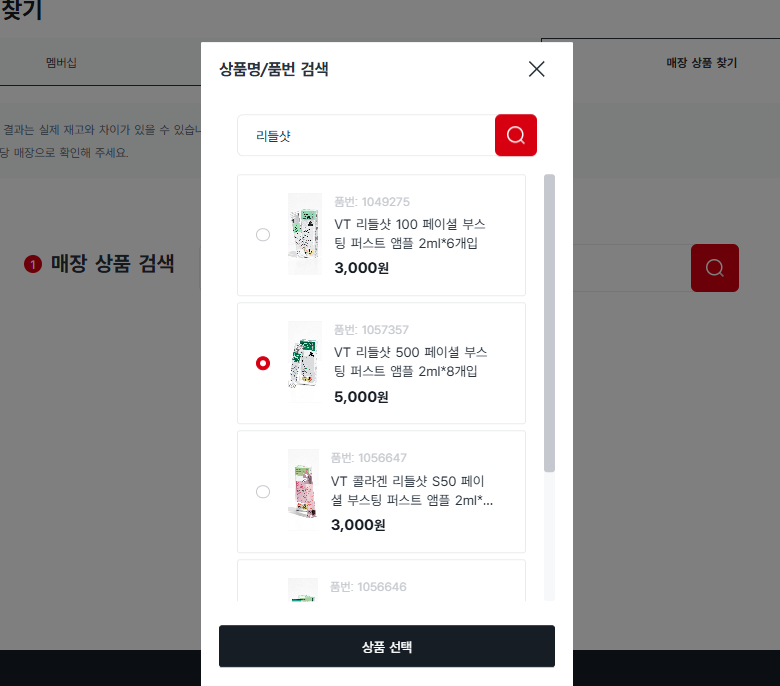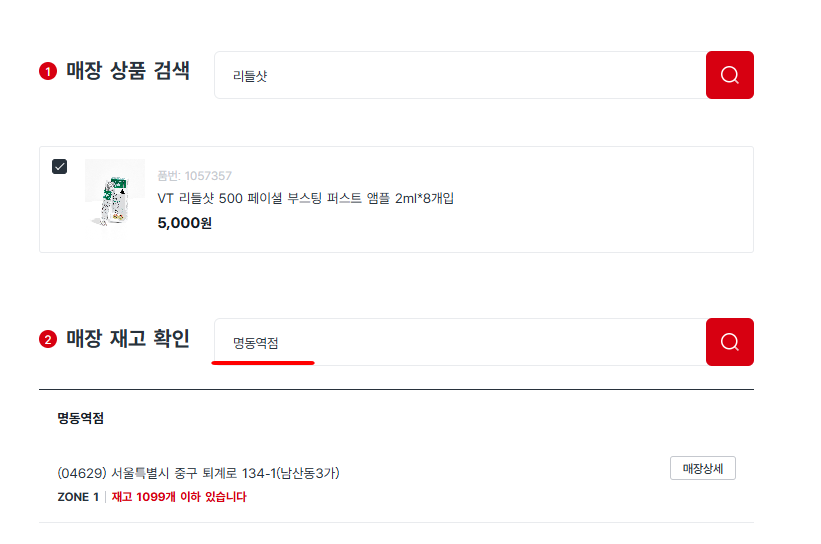 - 상품명과 매장명 선택하면 재고 확인 완료