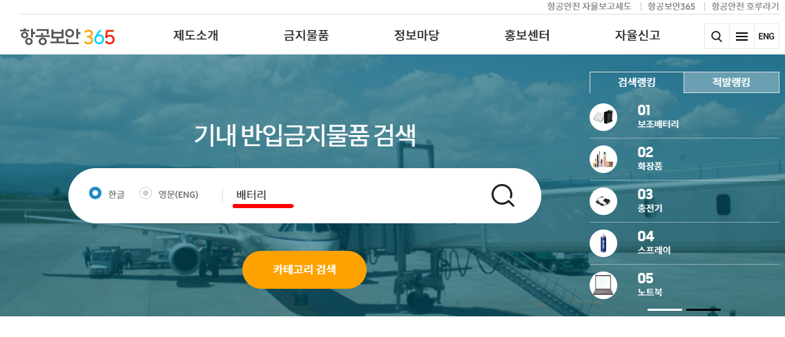 위에 나와있지 않은 물품을 가지고 가야 할 경우 아래 사이트에서 "기내반입금지물품 검색"에 물품을 적으면 조회가 가능합니다.