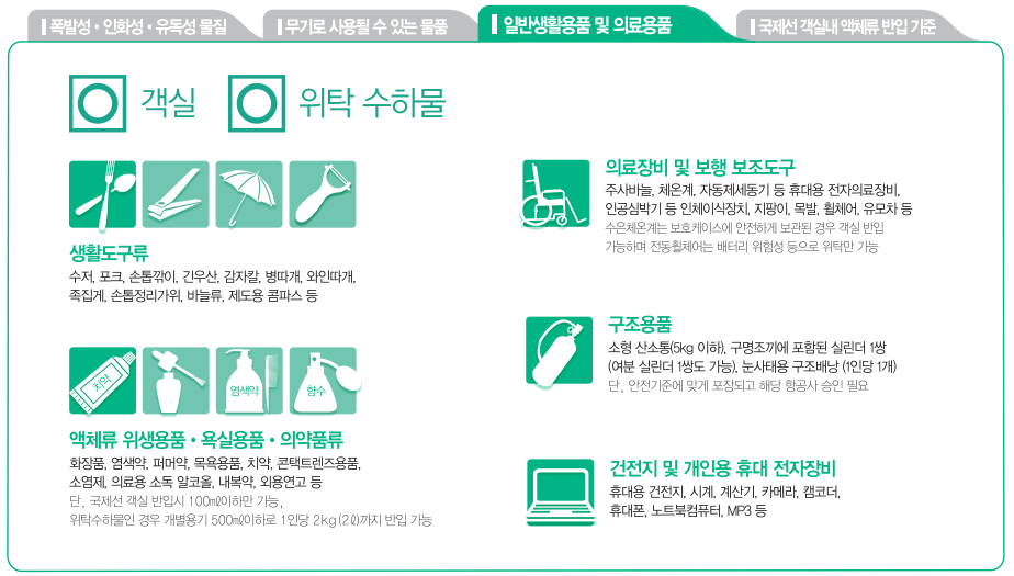 수저나 포크와 같은 생활용품이나 의료장비는 휴대 수하물, 위탁수하물 둘다 가능합니다.