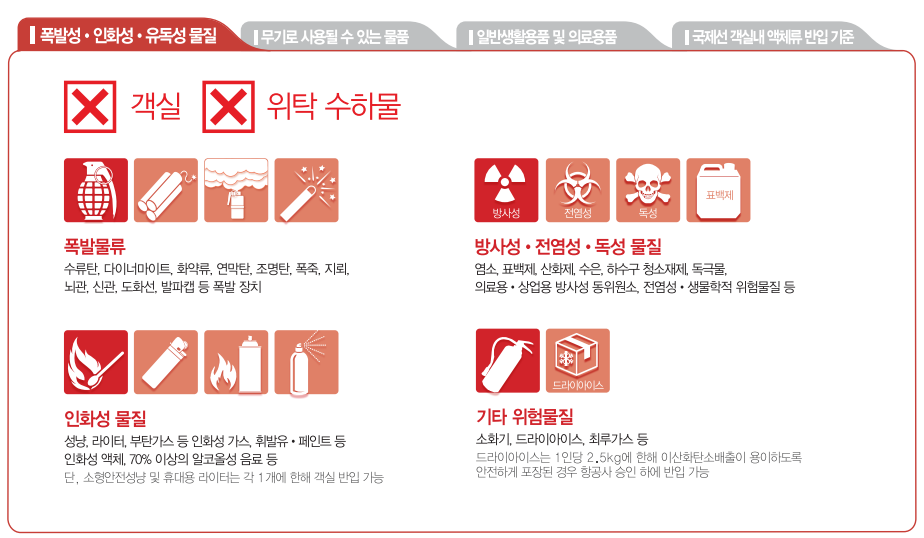 폭발성, 인화성, 유독성 물질은 위탁 수하물, 휴대 수하물 둘 다 불가합니다.