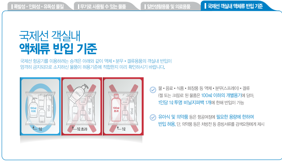 액체류의 경우 휴대 수하물로 기내로 가지고 들어가는 경우 아래의 기준을 꼭 따라주셔야 하며 허용 기준에 미달될 경우 반입 불가 합니다.