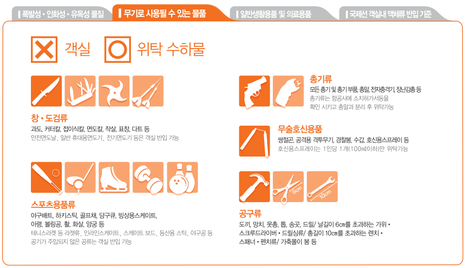 무기로 사용될 수 있는 칼이나 스포츠용품, 공구류, 삼각대 등은 위탁 수하물로만 가능합니다.
