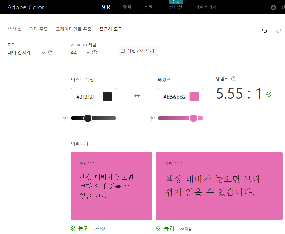 또한 키워드를 검색해서 나오는 이미지에서 어떤 컬러를 주로 쓰는지도 알 수 있고 특히 접근성 도구를 들어가면 배경색에 쓰는 글씨가 가독성이 좋은지 여부도 알 수 있습니다.