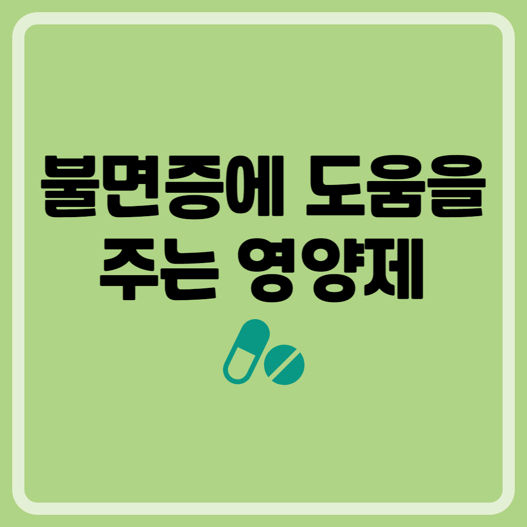 수면향상에 도움을 주는 영양제중 하나는 바로 마그네슘 입니다. 마그네슘은 근육을 이완시켜 편안함을 주기 때문에 불면증 증상을 완화하는 데 도움을 줄 수 있습니다. 비타민B6, 12는 신경 시스템에 영향을 주고 면역 체계를 강화하여 수면을 질을 향상시키는데 도움을 줄 수 있습니다. 또한 오메가3와 레시틴은 스트레스를 감소시켜주며, 세로토닌과 멜라토닌이라는 수면과 관련된 호르몬의 생성에 도움을 주기 때문에 수면의 질을 향상시키는데 도움을 줄 수 있습니다. 트립토판이라는 영양제는세로토닌과 멜라토닌 생성에 필요한 아미노산으로, 수면을 개선하는 데 도움을 주고 5히드록시트립테로판(5htp)은 세로토닌을 생성하는 중간체로, 수면과 관련된 호르몬에 영향을 미칠 수 있으며 천연 수면 호르몬으로 알려져 있는 멜라토닌은, 수면의 자연스러운 패턴을 조절하는 데 도움을 줄 수 있습니다.