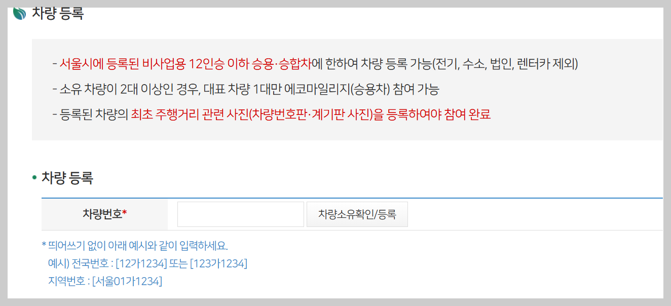 에코마일리지 참여를 위해서는 본인이 직접 차량을 등록해야 하며, 공동명의 차량의 경우 대표 명의자가 신청할 수 있습니다.