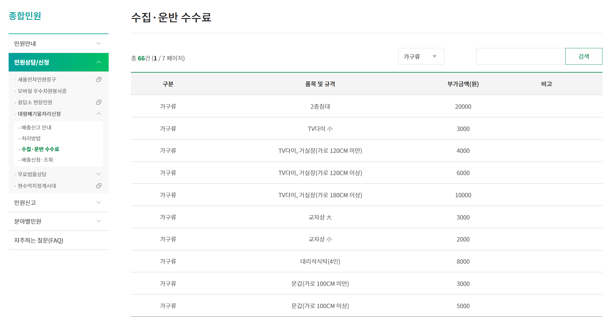 강서구 대형폐기물 가격 구청 홈페이지 > 종합민원 > 민원상담/신청 > 수집·운반 수수료 확인 가능합니다.