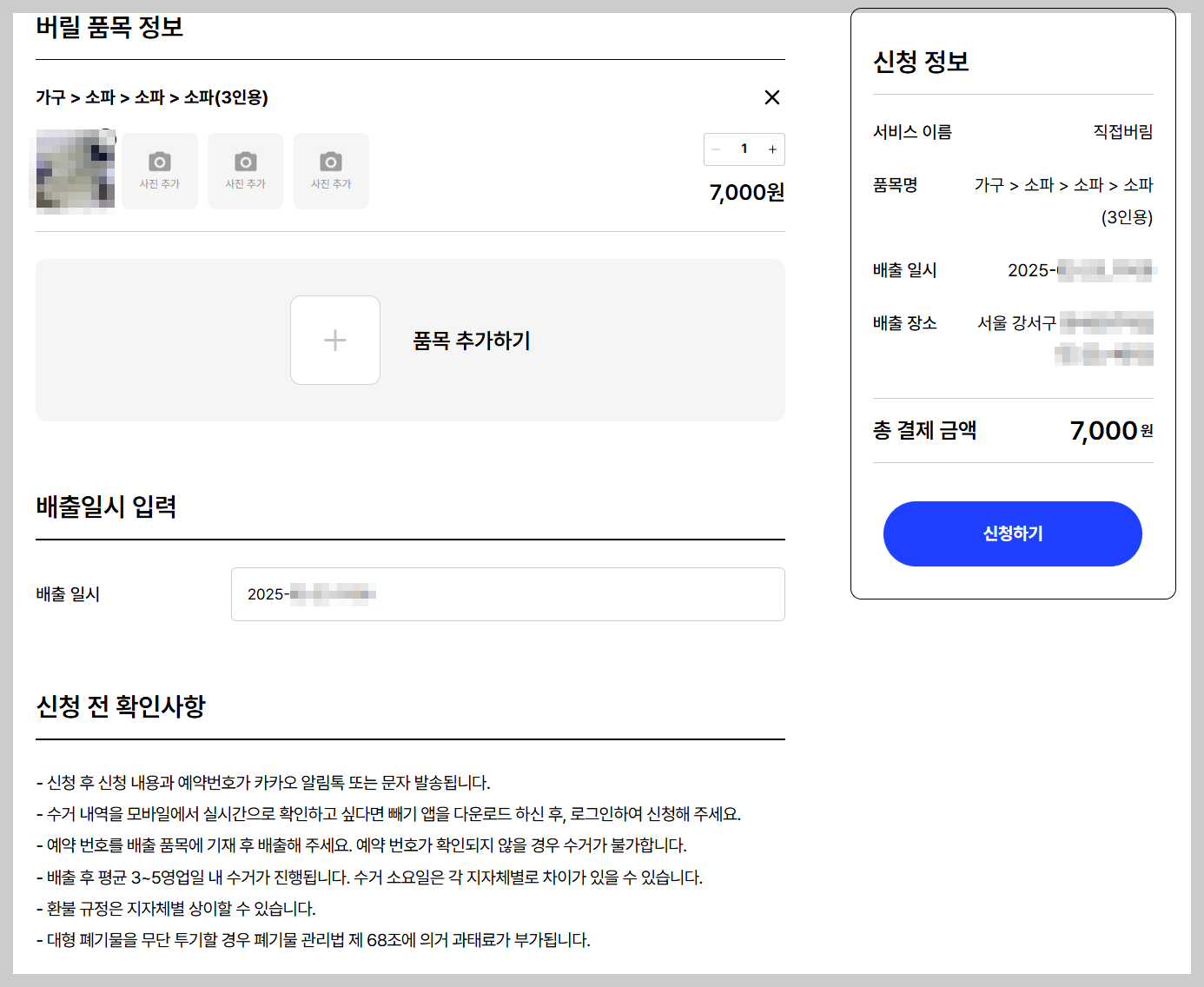 3. 품목을 검색해서 추가해 주세요. 저는 3인 소파를 버려야 해서 선택했고 사진을 찍으면 더 수월하게 수거할 수 있다고 해서 사진을 찍어서 첨부했습니다.