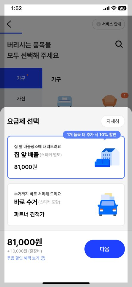 단, 접수는 빼기 앱에서만 가능하며 폐기물 비용 외에 서비스 비용이 들어갑니다.