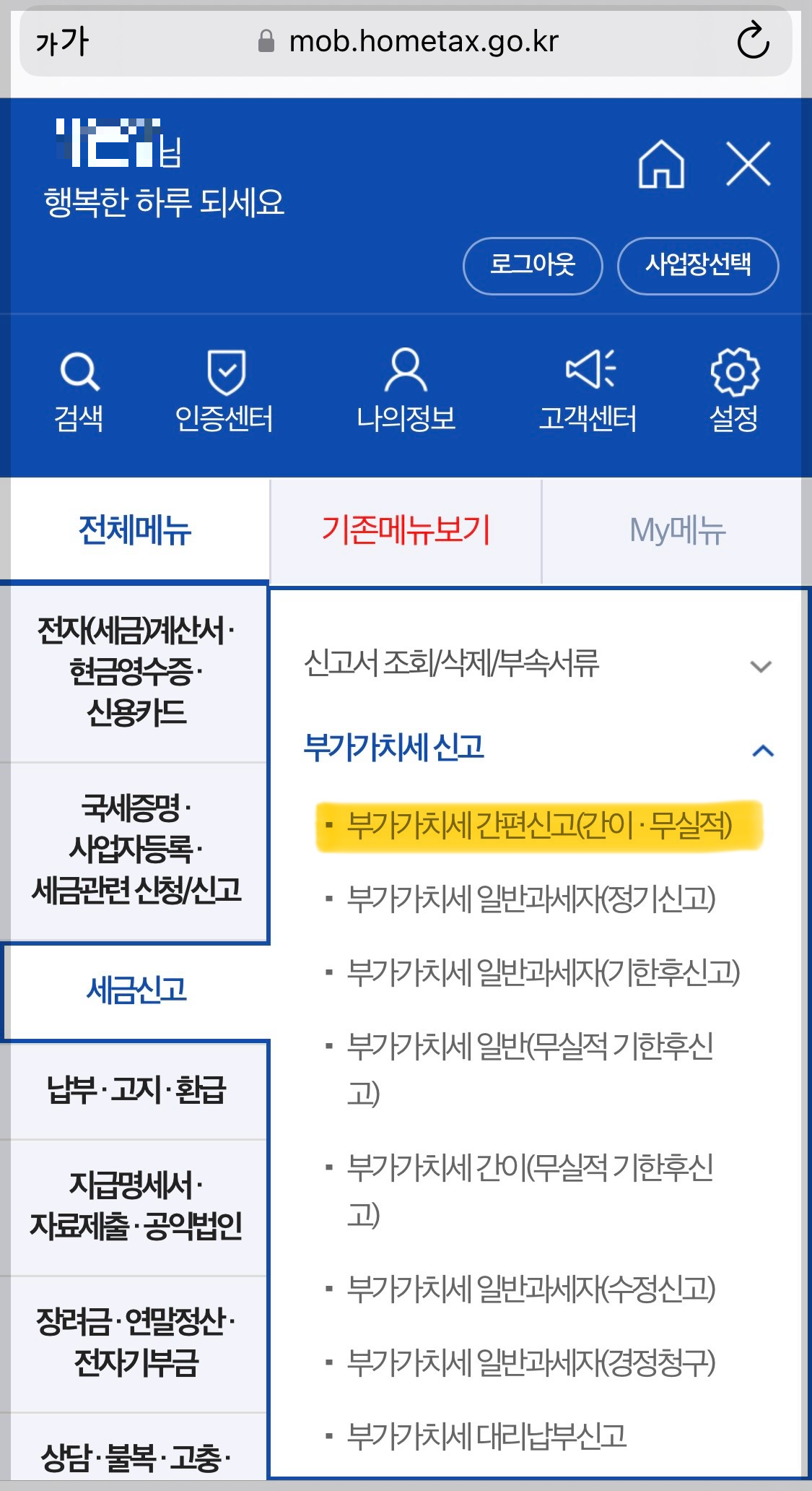 - 모바일 홈택스 또는 어플에 접속하여 전체메뉴 > 세금신고 > 부가가치세 간편 신고를 클릭합니다.