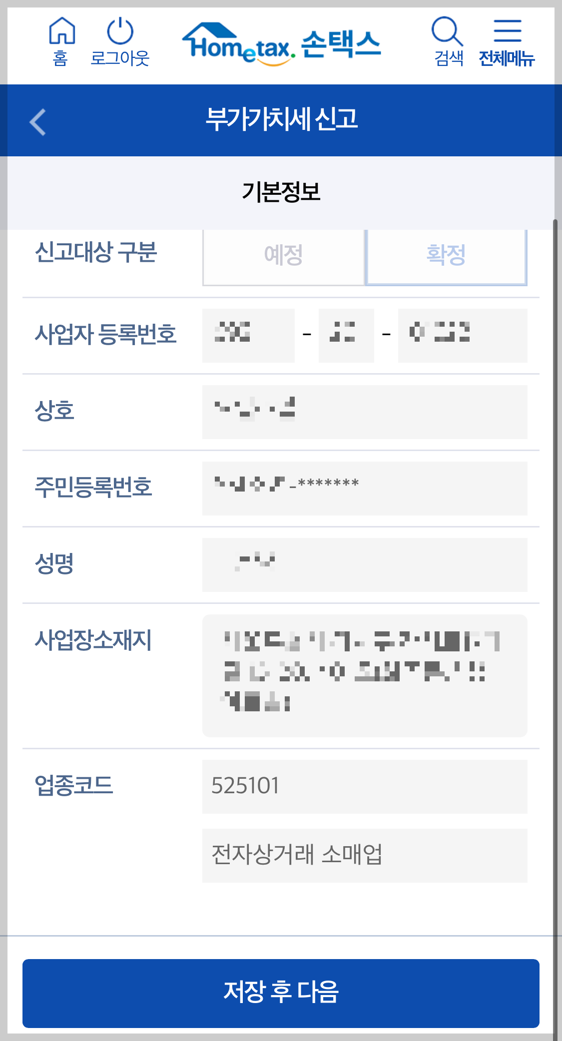 - 사업자 번호와 기본정보가 맞는지 확인 후 저장 후 다음 버튼을 클릭합니다.