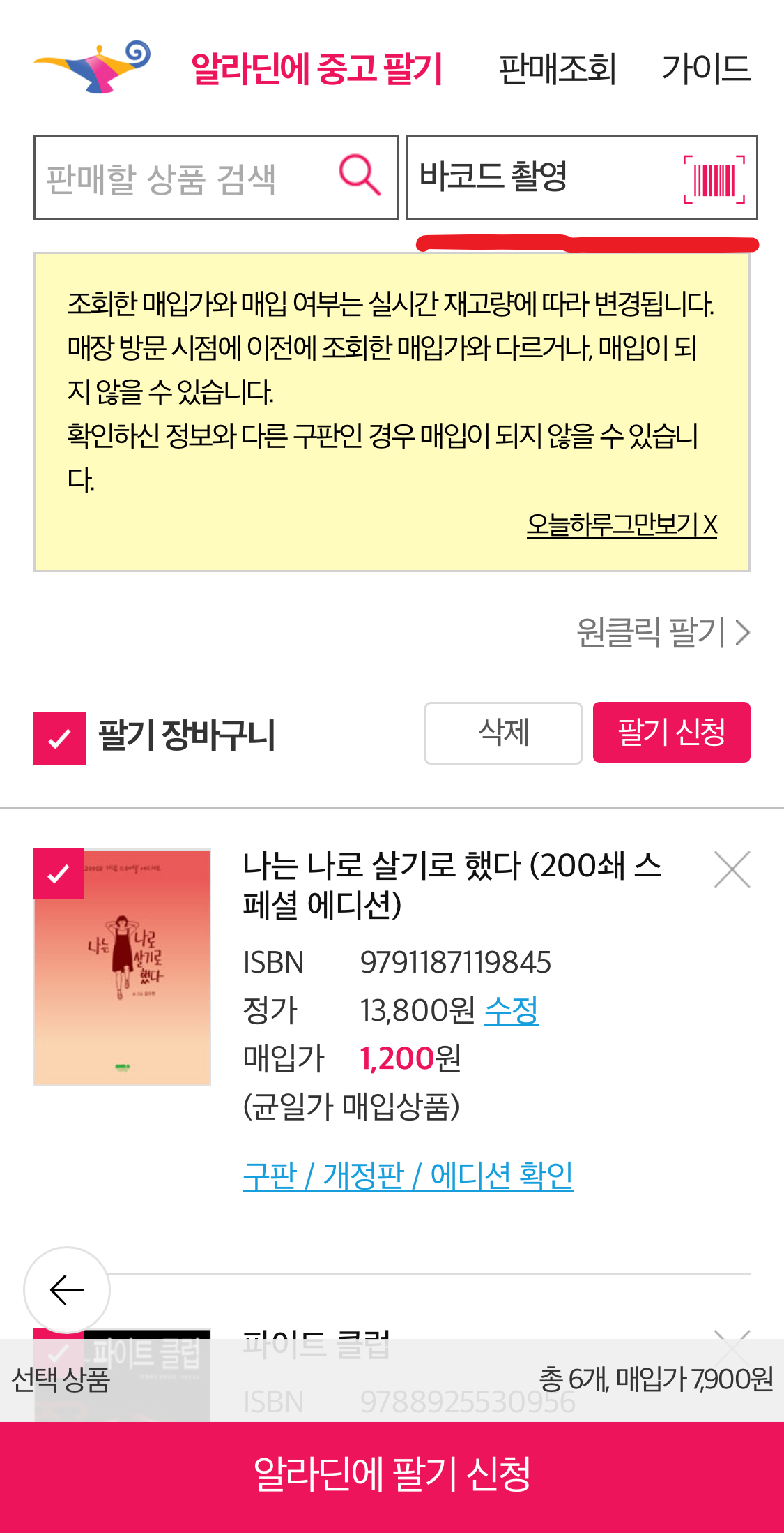 - 알라딘에 중고 팔기 화면에서 "바코드 촬영"을 해서 현재 매입 가능한 책인지 확인합니다.