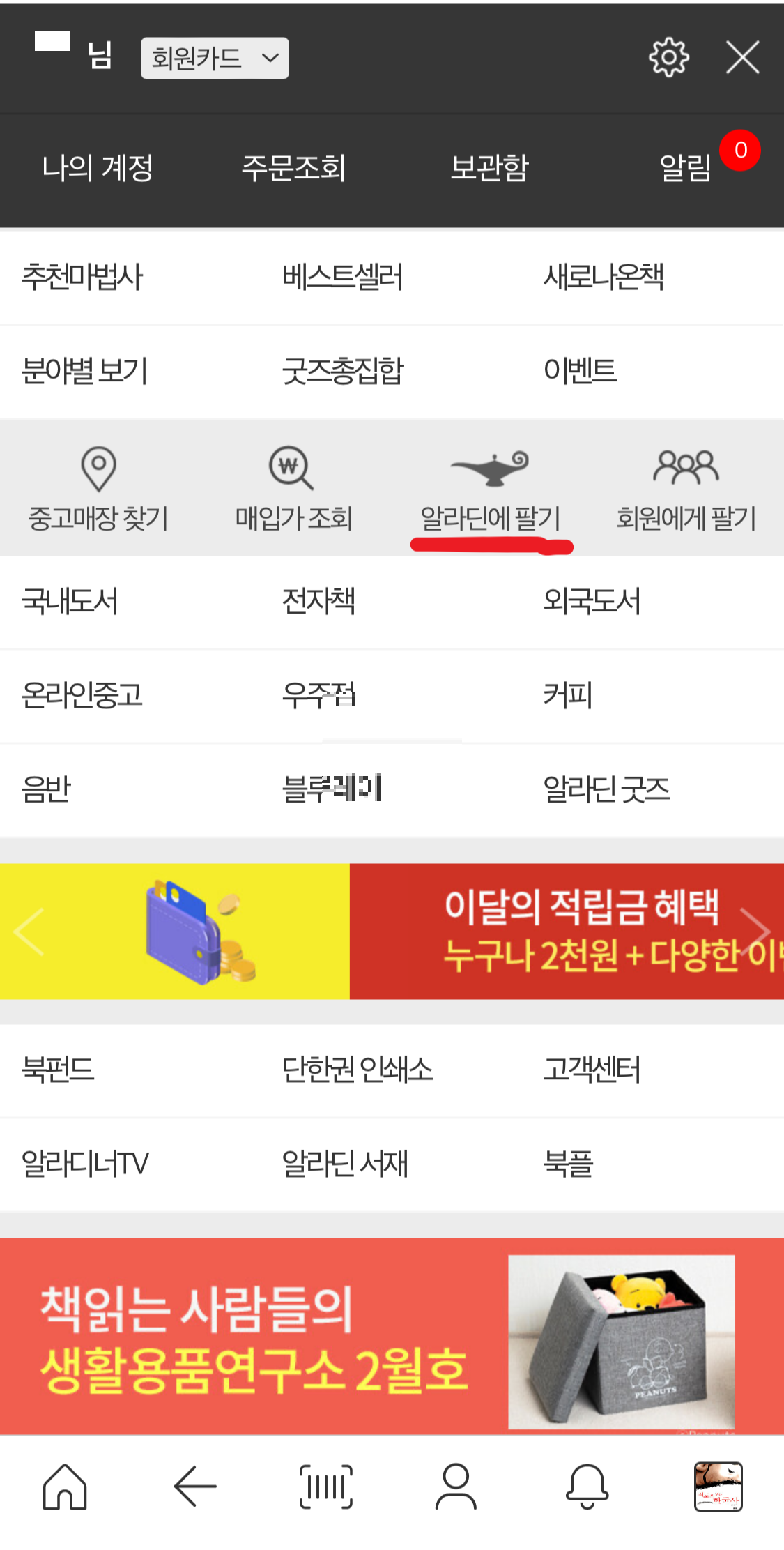 - 앱 왼쪽 햄버거 버튼 클릭 후 "알라딘에 팔기"를 선택하여 알라딘에 중고 팔기 메뉴로 이동
