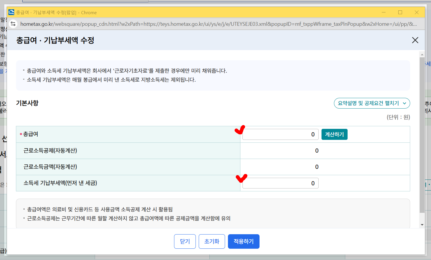 - 소득과 소득세를 입력 후 적용하기 버튼을 클릭합니다.