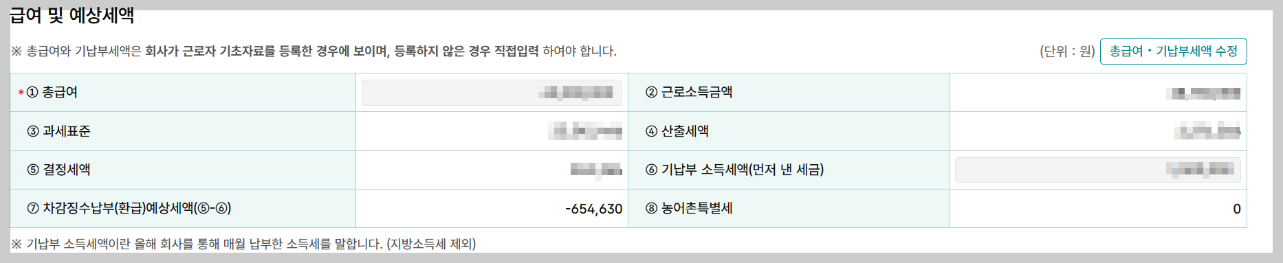 - 7번 차감징수납부세액이 마이너스이면 환급, 표시가 없다면 추가납부가 필요합니다.