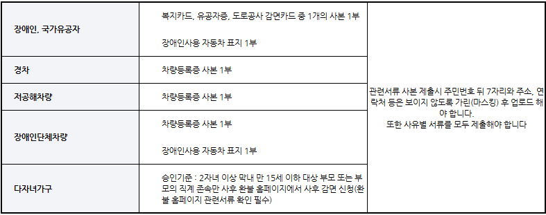 - 장애인, 국가유공자, 5·18 민주유공자, 고엽제 후유증 환자: 50% 감면