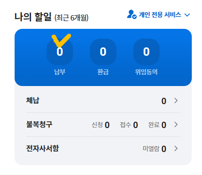 3. 나의 할일에서 "납부"를 클릭 후 납부해야 하는 목록을 확인하고 납부를 진행할 수 있습니다.