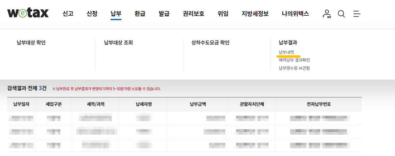 납부한 내역은 납부 > 납부내역 > 기간설정 후 조회 버튼을 누르면 전체 내역에 대해서 확인할 수 있습니다.