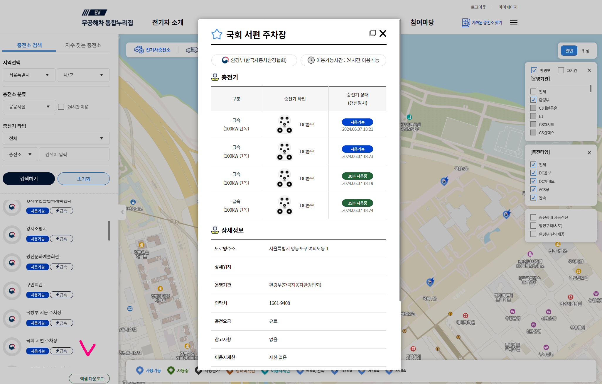 왼쪽에 있는 위치를 누르면 몇 개가 설치되어 있는지 현재 사용할 수 있는 충전기가 몇 개 인지 확인 가능합니다.
