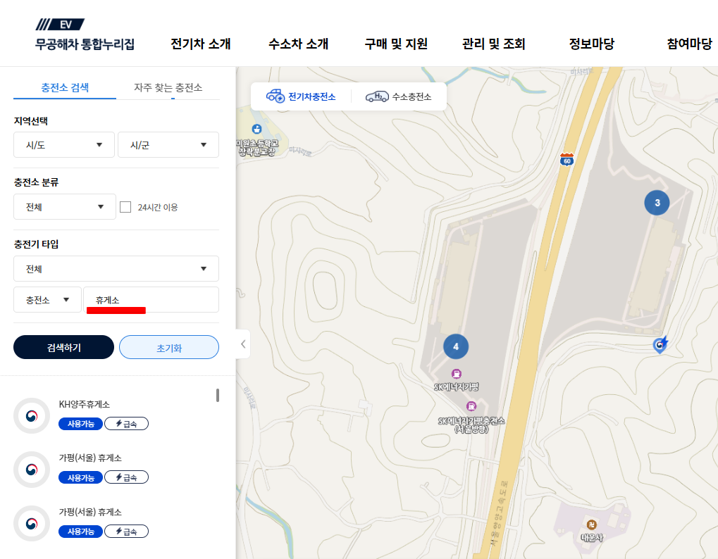 그럴 때에는 전기차 충전소 사이트에 들어가 충전소 검색어를 "휴게소"라고 검색 후 조회 버튼을 누르면 확인할 수 있습니다.