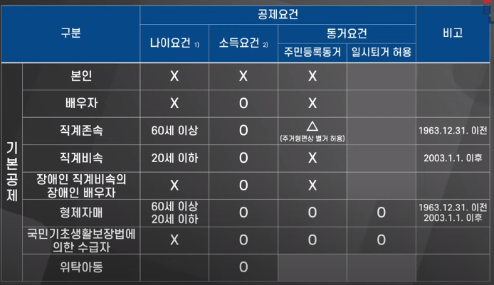 - 나이요건 : 장애인의 경우에는 나이는 적용하지 않으며 당해 과세기간 중 공제기준일이 해당하는 날이 있는 경우 적용