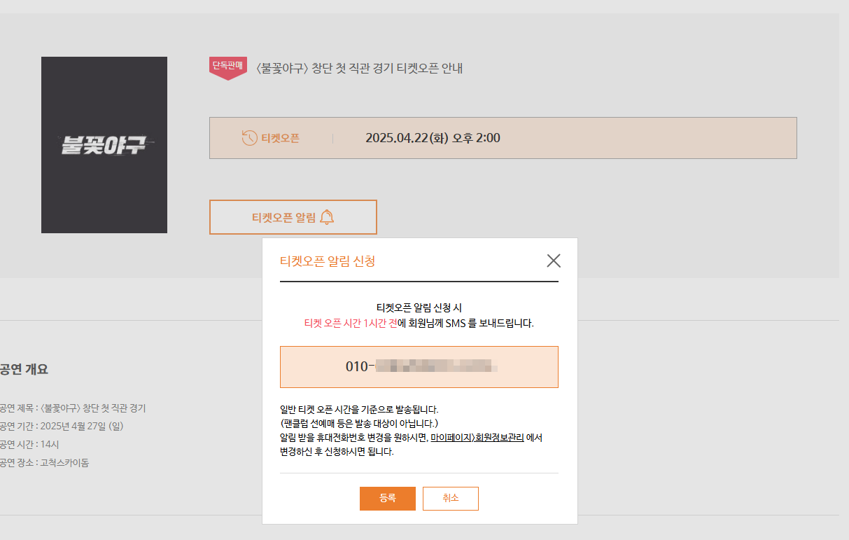 - 티켓오픈알림설정: 알림설정을 하면 오픈 1시간에 전에 문자를 받을 수 있어요. 아니면 핸드폰 알람을 해놔서 까먹지 않는것도 방법입니다.