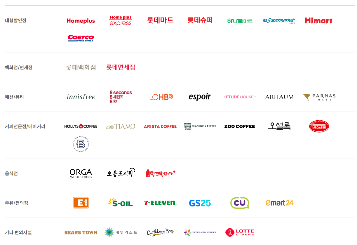 - 패션/뷰티 : 이니스프리, 에잇세컨즈, 롭스, 에스쁘아, 에뛰드하우스, 아리따움, 파르나스몰