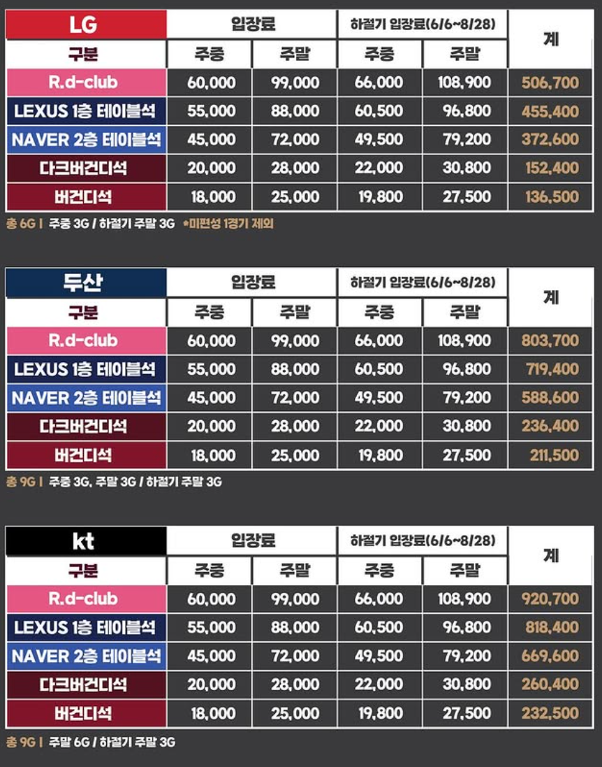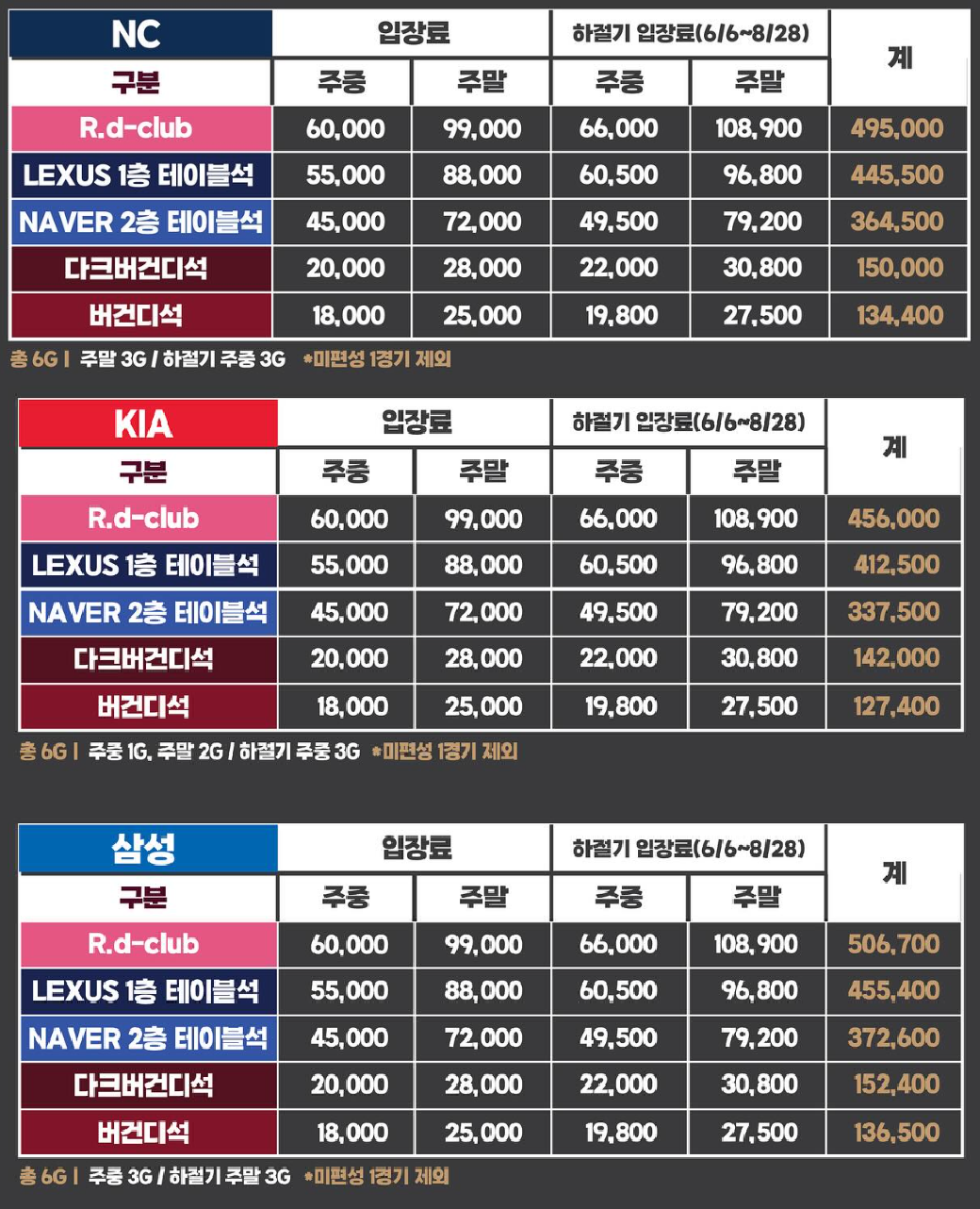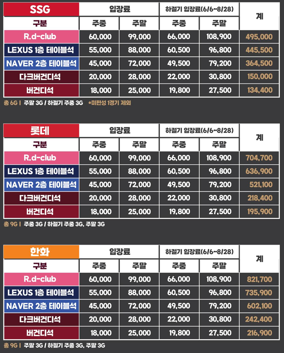 주중과 주말 그리고 하절기 시즌 가격이 다르기 때문에 원정팀마다 가격은 상이합니다.