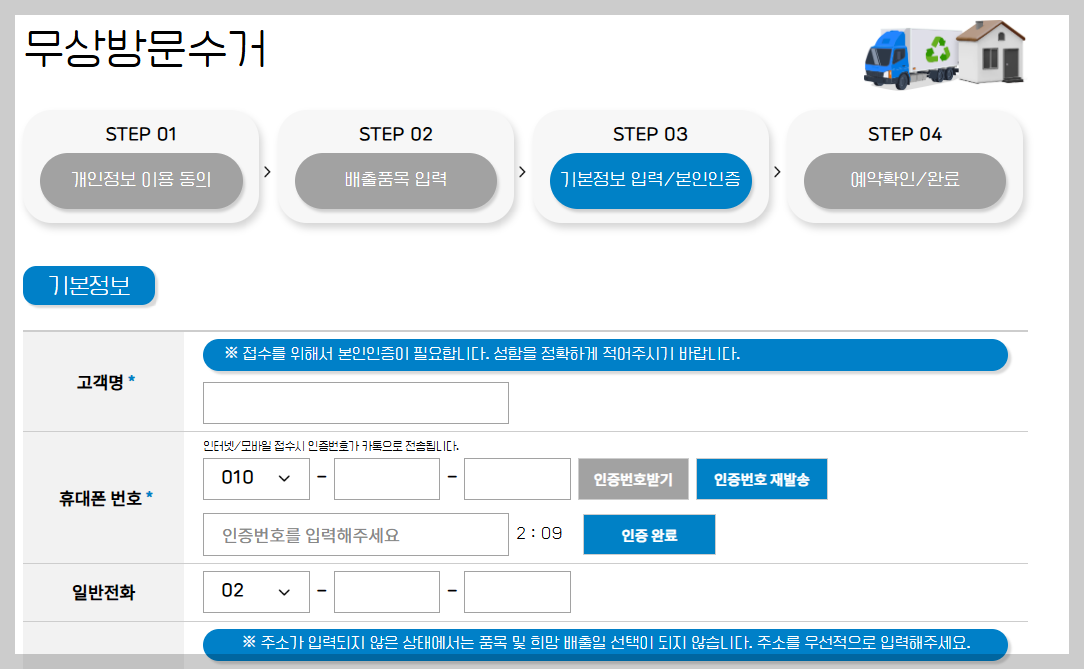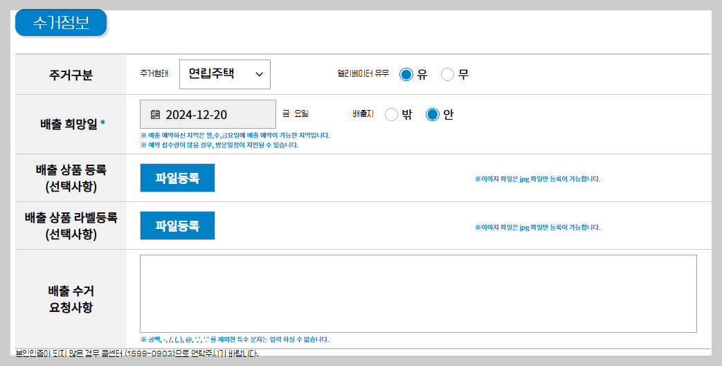이때, 수거 품목에 따라 1개 여도 되고 5개 이상이어야 가능한 경우도 있으니 꼭 체크하셔야 합니다.