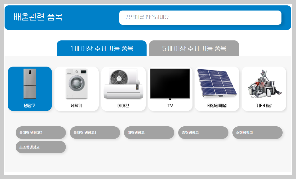 냉장고, 세탁기, 에어컨 등 대형가전의 경우에는 1개여도 방문수거를 신청할 수 있습니다.