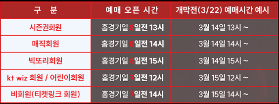 KT위즈의 유료회원에 가입하면 경기일 8일 전 13시부터 예매가 가능합니다.