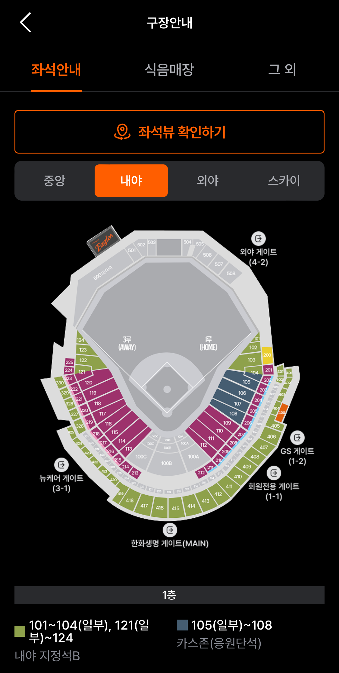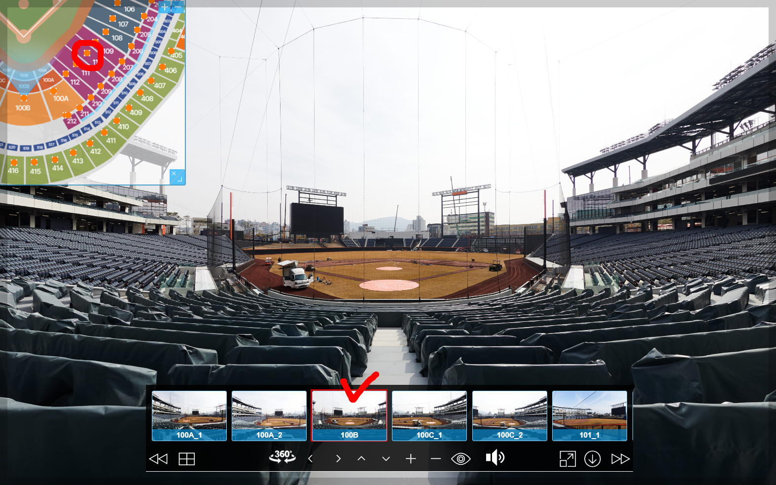 각 좌석에서 바라본 실제 구장 뷰를 360도 이미지로 제공하기 때문에, 시야 사각지대나 거리감을 예매 전에 파악할 수 있어 실용적입니다.