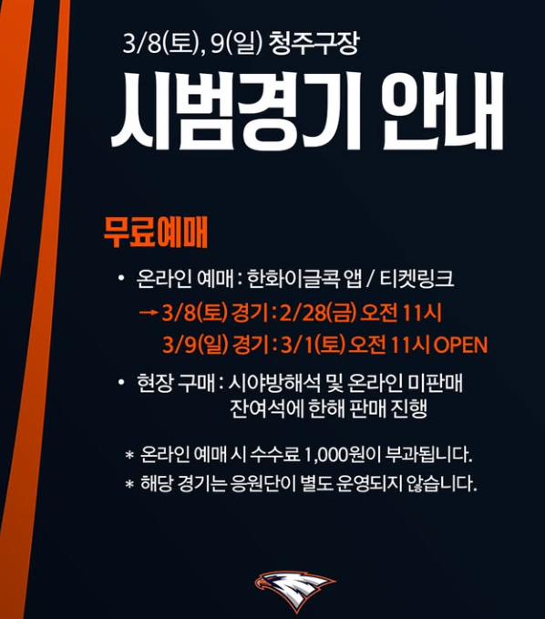 3월 8일과 9일 청주구장에서 한화이글스 vs 두산베어스의 시범경기가 예정되어 있습니다.
