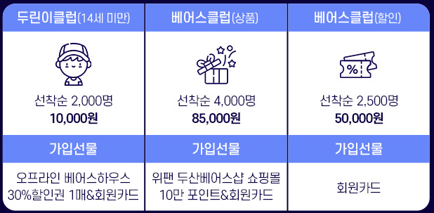 가입비 : 두린이 클럽 - 10,000원 / 베어스클럽(상품) - 85,000원 / 베어스클럽(할인) - 50,000원