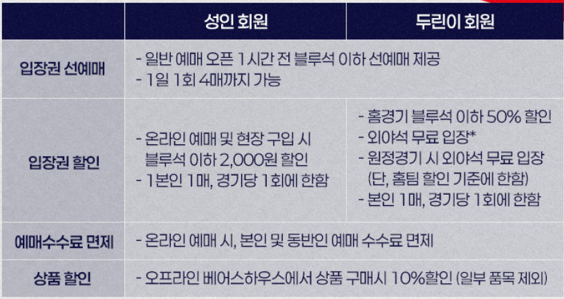 두린이 회원의 경우에는 블루석 이하 50% 할인되며 외야석 무료입장 가능합니다.
