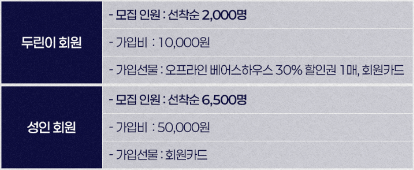 - 가입선물 : 두린이회원 - 오프라인 베어스하우스 30% 할인권 1매 & 회원카드 / 성인회원 - 회원카드