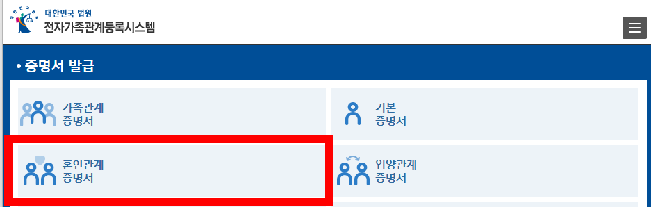혼인관계 증명서는 전자가족관계등록시스템에서 발급 가능합니다.