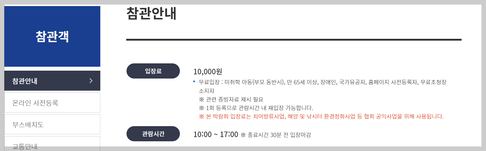 - 무료입장 가능자 : 미취학 아동(부모 동반시), 만 65세 이상, 장애인, 국가유공자, 홈페이지 사전등록자, 무료초청장 소지자