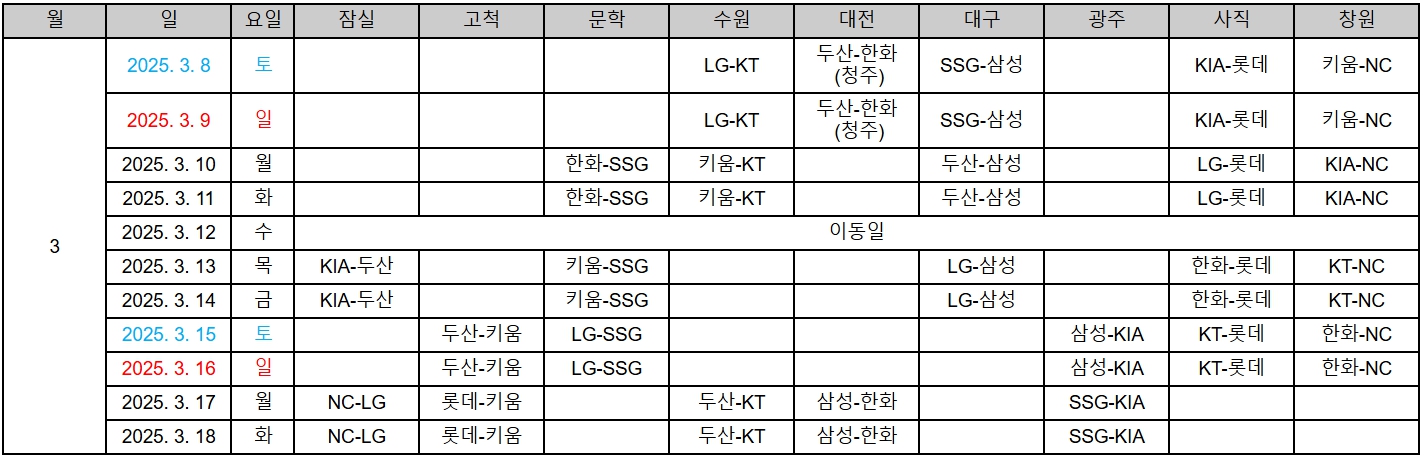 2025년 프로야구 시범경기 일정을 발표 했습니다.