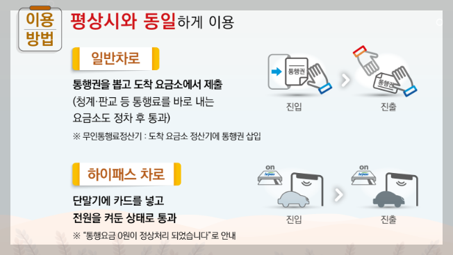 - 하이패스 이용 차량 → 단말기를 켜둔 채 요금소를 통과하면 자동으로 ‘0원’ 처리