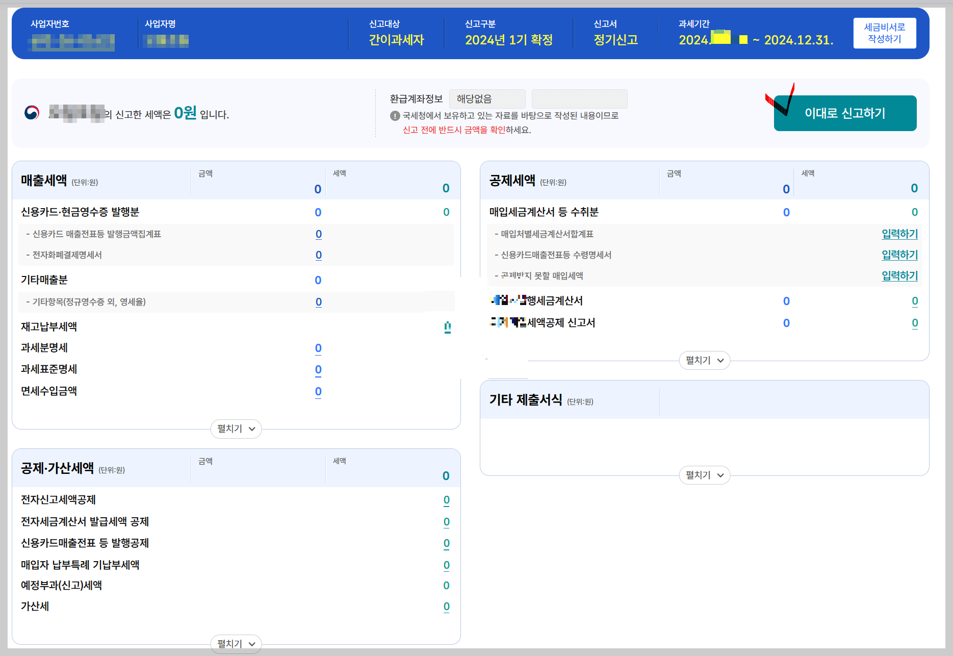 홈택스 로그인 > 세금신고 > 부가가치세 신고 > 부가가치세 과세신고(일반·간이·대리납부) 클릭 > 기본정보입력 > 이대로신고하기