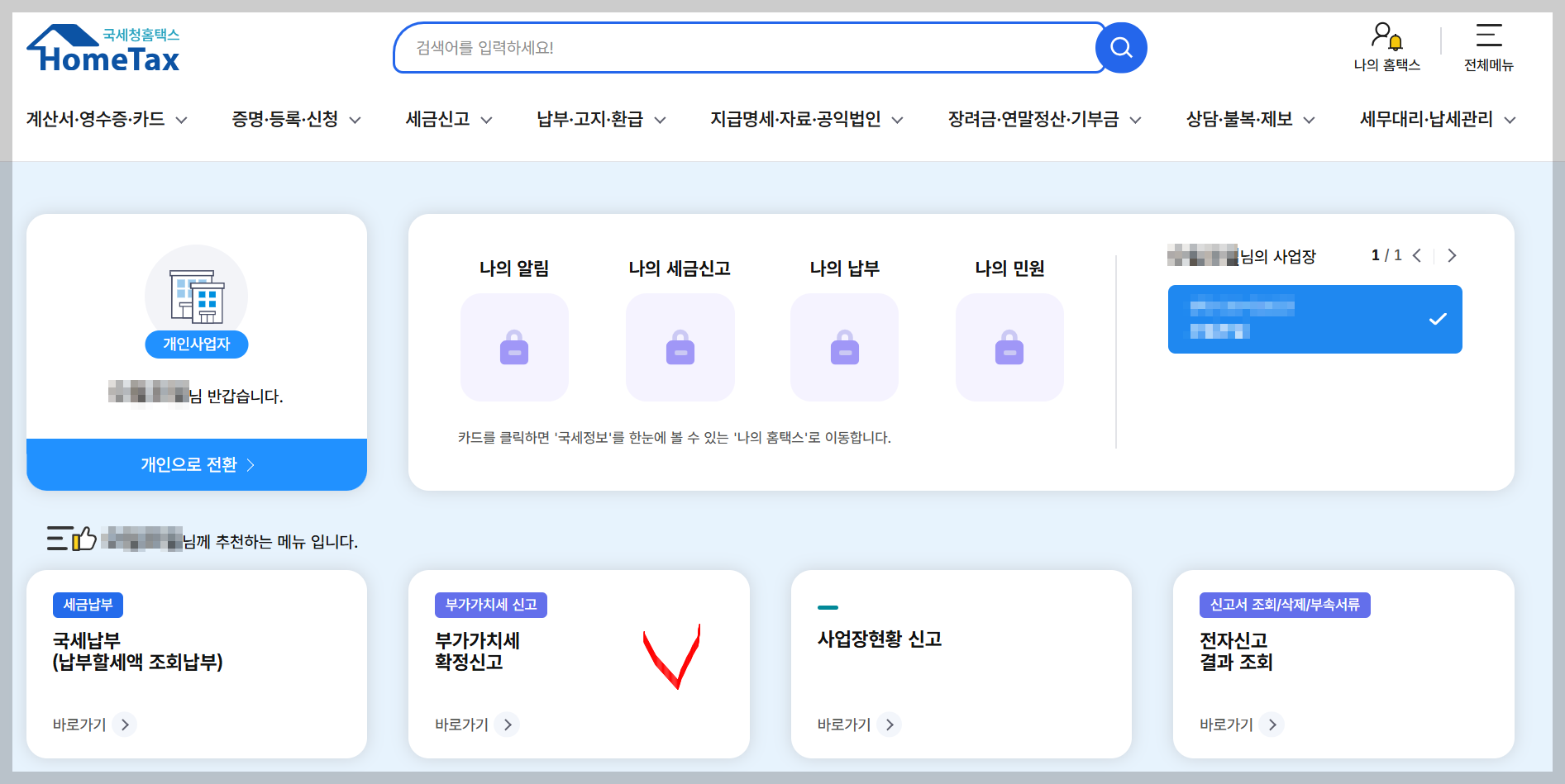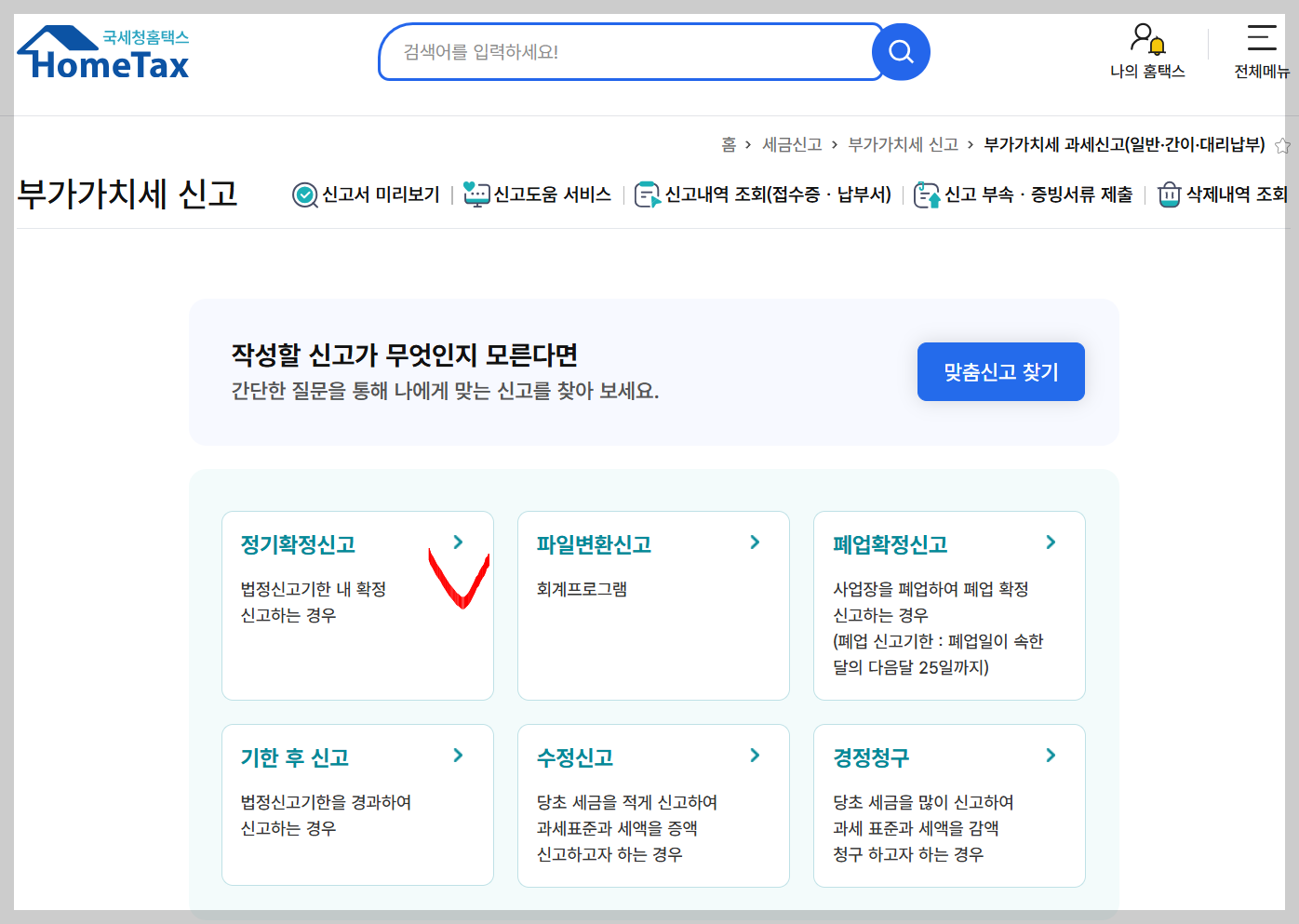 - 홈택스에 접속하여 부가가치세 신고를 선택합니다.