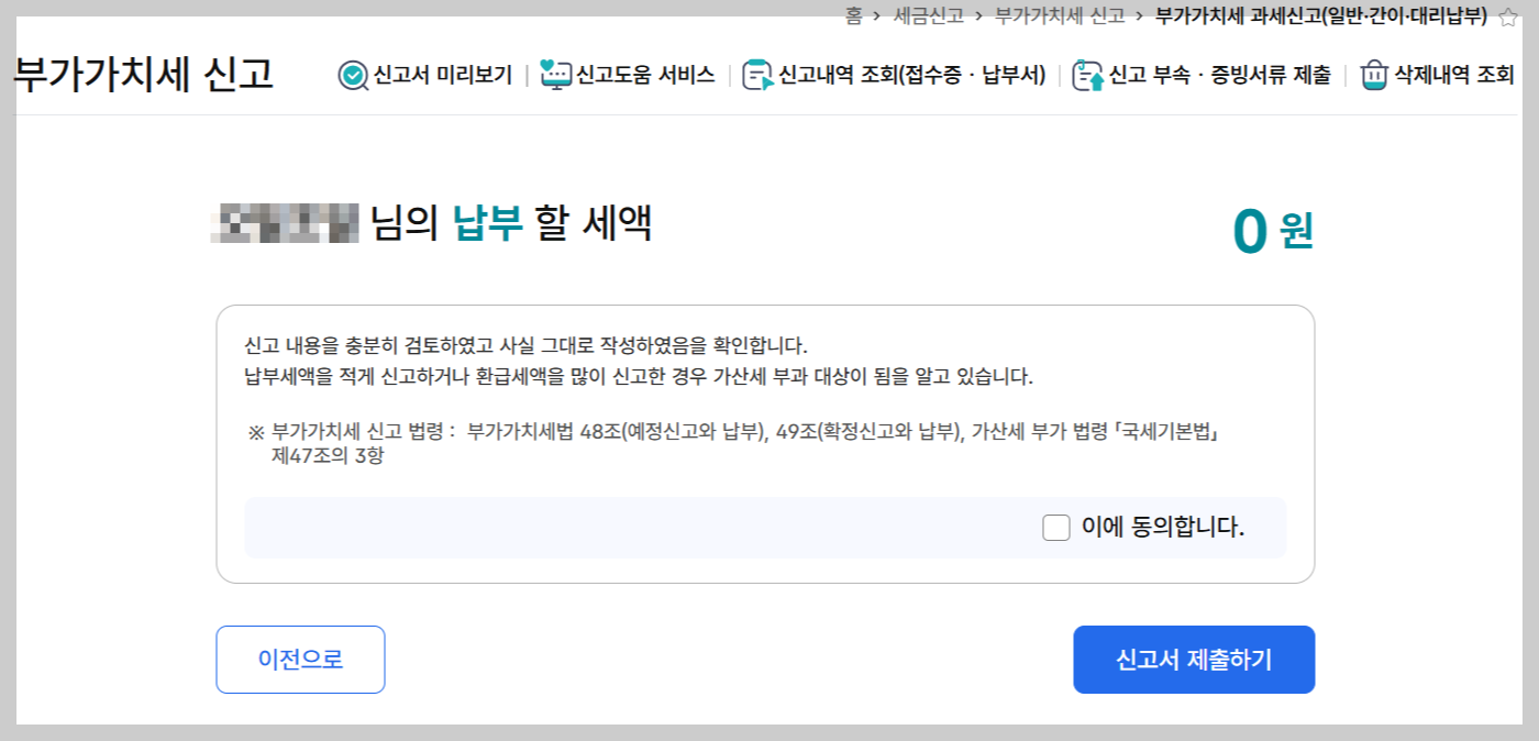 - 이에 동의합니다 에 체크 후 신고서 제출하기를 누르면 끝입니다.