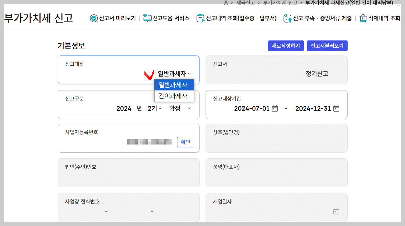 - 신고대상에 일반과세자를 간이과세자로 변경 후 사업자등록번호를 선택합니다.
