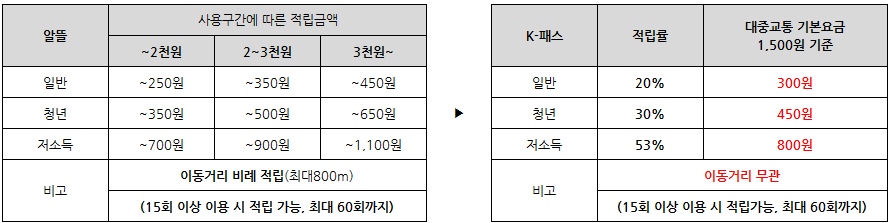 K패스는 기존에 사용하고 있던 알뜰 교통카드의 불편함을 해소하고, 일반, 청년, 저소득층의 혜택을 강화하는 대중교통카드입니다.